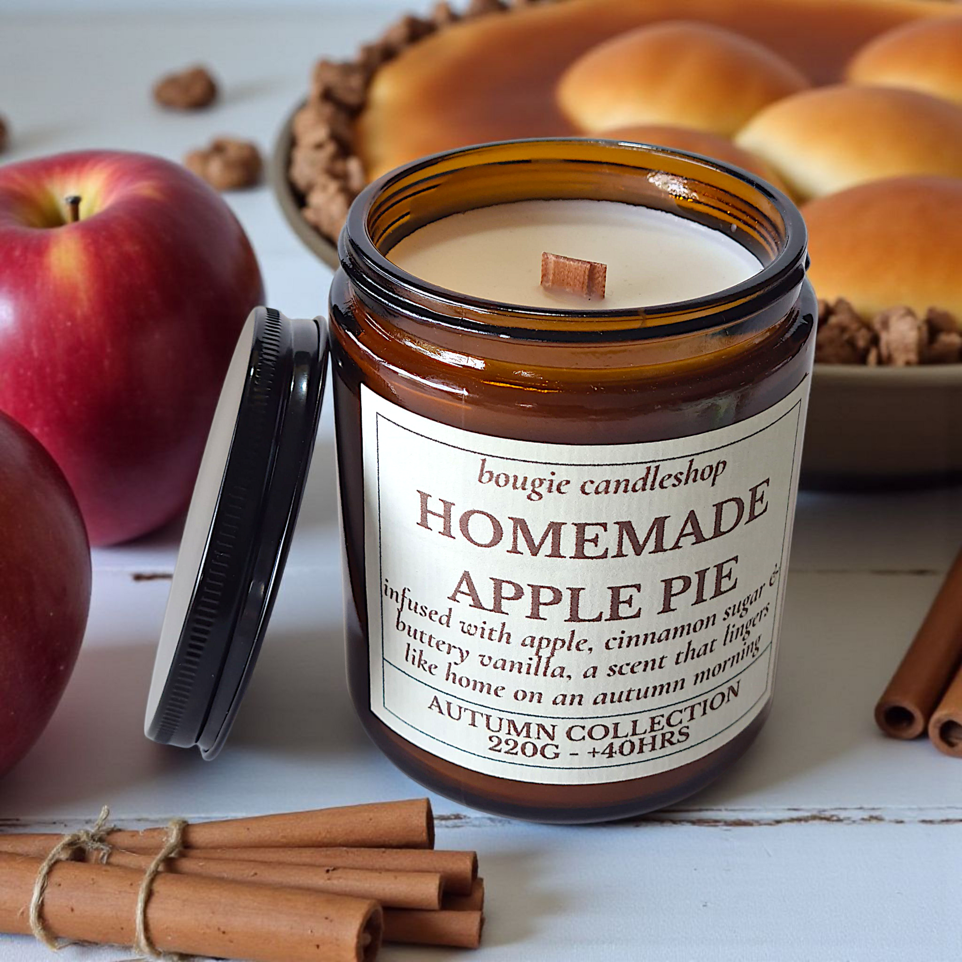 Homemade Apple Pie roept het warme gevoel op van versgebakken appeltaart op een frisse herfstdag. De geur van zoete appels en kaneel gaat moeiteloos over in romige vanille en bruine suiker – troostend, huiselijk en heerlijk nostalgisch.