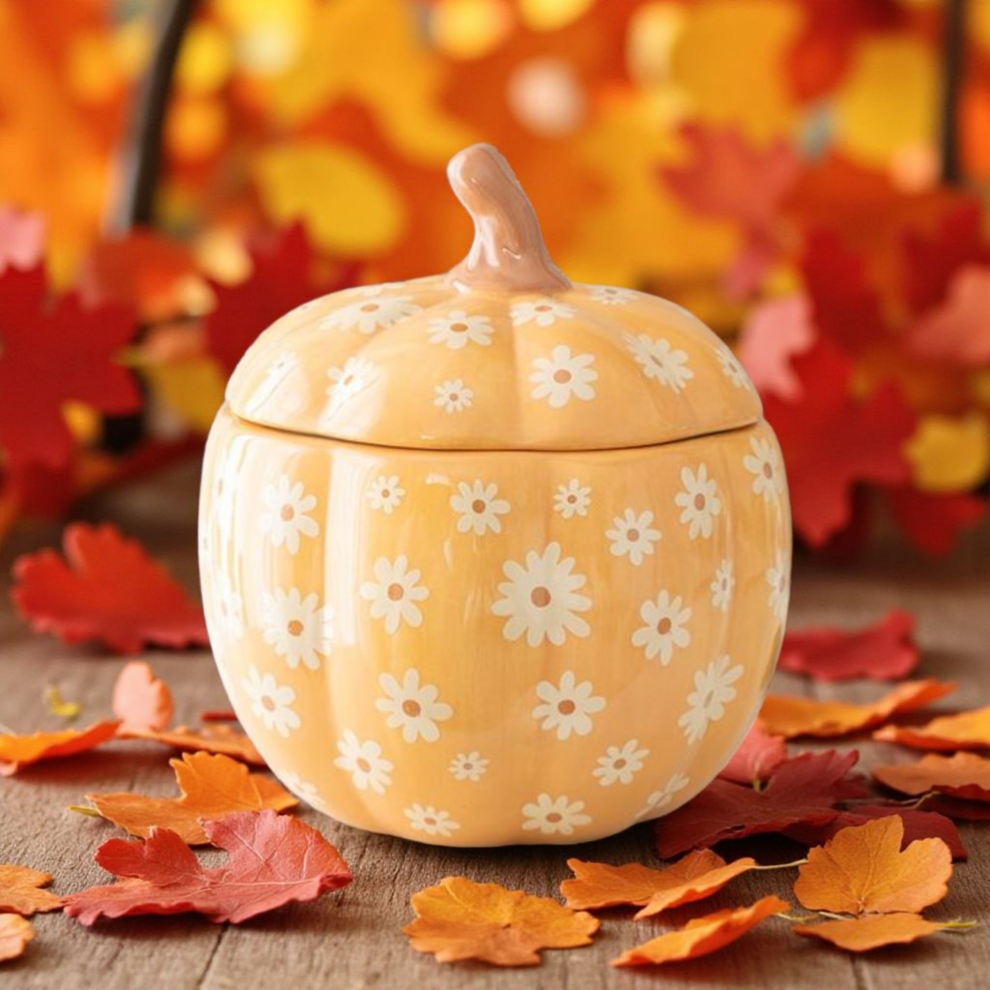 Een keramische waxwarmer in pompoenvorm, afgewerkt met een retro bloemenpatroon. Het theelichtje verwarmt je waxmelts of geurolie gelijkmatig—brand altijd zonder deksel voor de beste geurverspreiding. Een vrolijk én functioneel accent in huis.